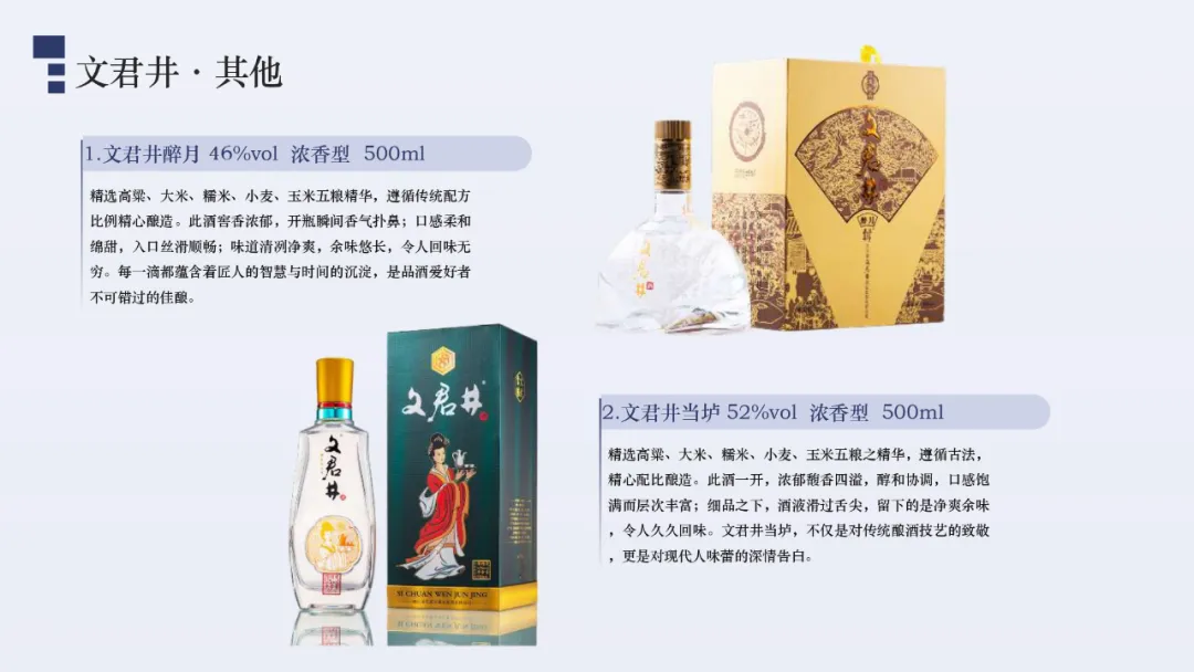 具有上百年釀酒歷史的四川文君井酒業集團,是一家集科研、生產、銷售、技術、服務為一體的大型白酒生產企業,為中國最大白酒原酒基地釀酒頭部企業之一,現有窖池3000余口,年產優質原酒上萬噸,常年儲存濃香型原酒20000余噸,為首屆四川省原酒生產企業20強。經過幾十年的成長,集團已進入中國白酒行業前沿,成為行業領先的綜合性大型白酒企業。