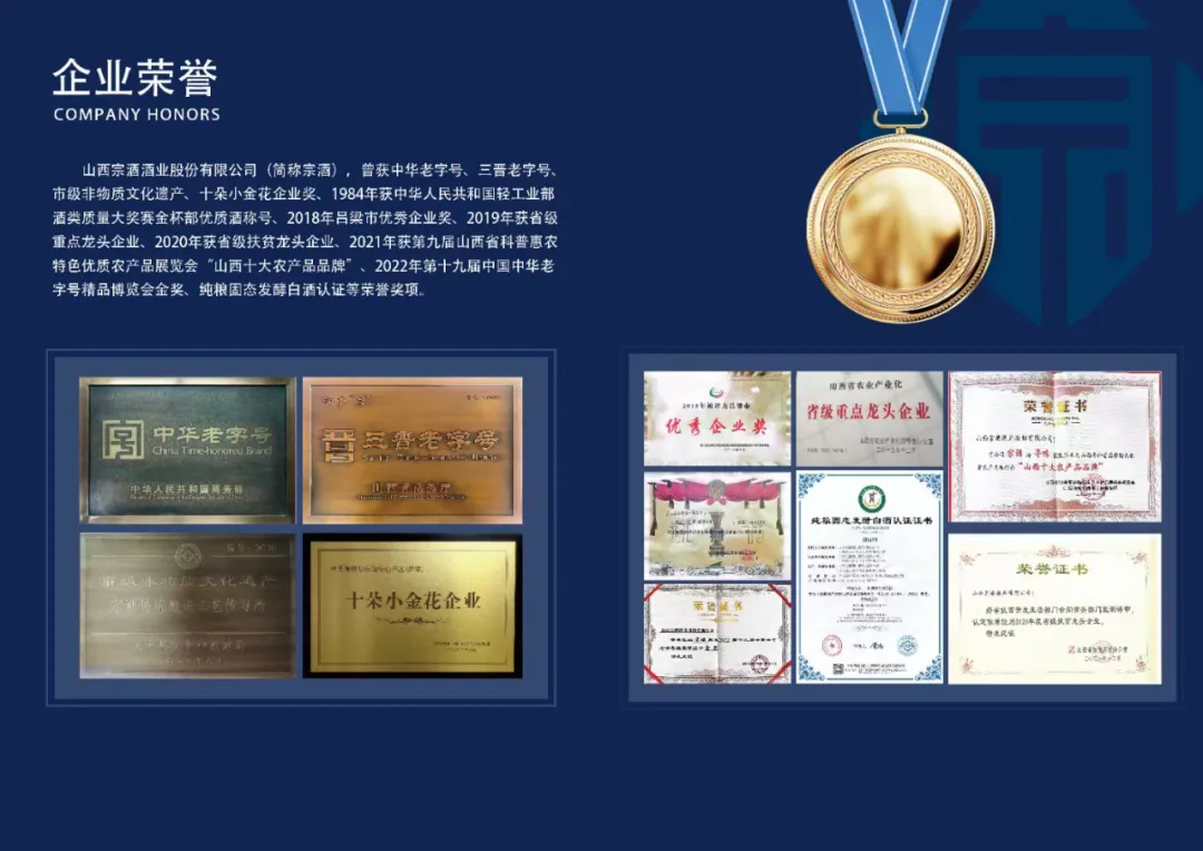 山西宗酒酒業股份有限公司(簡稱宗酒),曾獲中華老字號三晉老字號、市級非物質文化遺產、十朵小金花企業獎、1984年獲中華人民共和國輕工業部酒類質量大獎賽金杯部優質酒稱號、2018年呂梁市優秀企業獎、2019年獲省級重點龍頭企業、2020年獲省級扶貧龍頭企業、2021年獲第九屆山西省科普惠農特色優質農產品展覽會“山西十大農產品品牌”、2022年第十九屆中國中華老字號精品博覽會金獎、純糧固態發酵白酒認證等榮譽獎項。