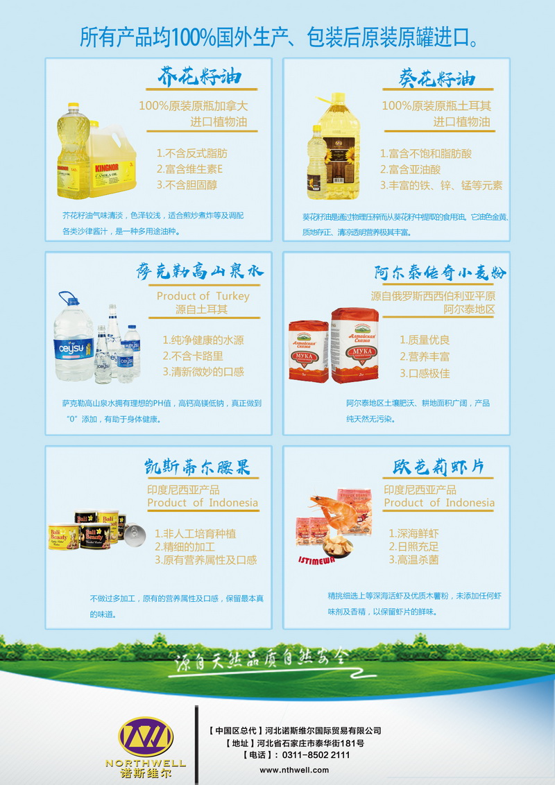 河北諾斯維爾國際貿(mào)易有限公司是倡導(dǎo)進(jìn)口健康食品、引領(lǐng)健康廚房革命的專業(yè)進(jìn)口商,公司擁有一支經(jīng)驗(yàn)豐富的專業(yè)管理團(tuán)隊(duì)。為消費(fèi)者提供天然、安全、綠色、營養(yǎng)、健康的食品以及節(jié)能、環(huán)保、時(shí)尚的廚房用具,打造“產(chǎn)品溯源、品質(zhì)卓越、健康生活”的消費(fèi)理念。讓您同步享受全世界高品質(zhì)的健康新生活。