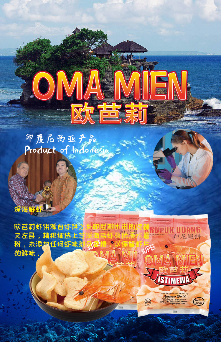【恩絲爾】鮮蝦餅:含蝦量高達(dá)45%,不含任何化學(xué)物質(zhì),嚴(yán)格執(zhí)行印尼政府制定的食品藥品生產(chǎn)規(guī)范,且獲得了由印尼總統(tǒng)親自頒發(fā)的美食證書,獲得了印尼政府的食藥品監(jiān)督管理局授權(quán),保證安全,放心享用美味。