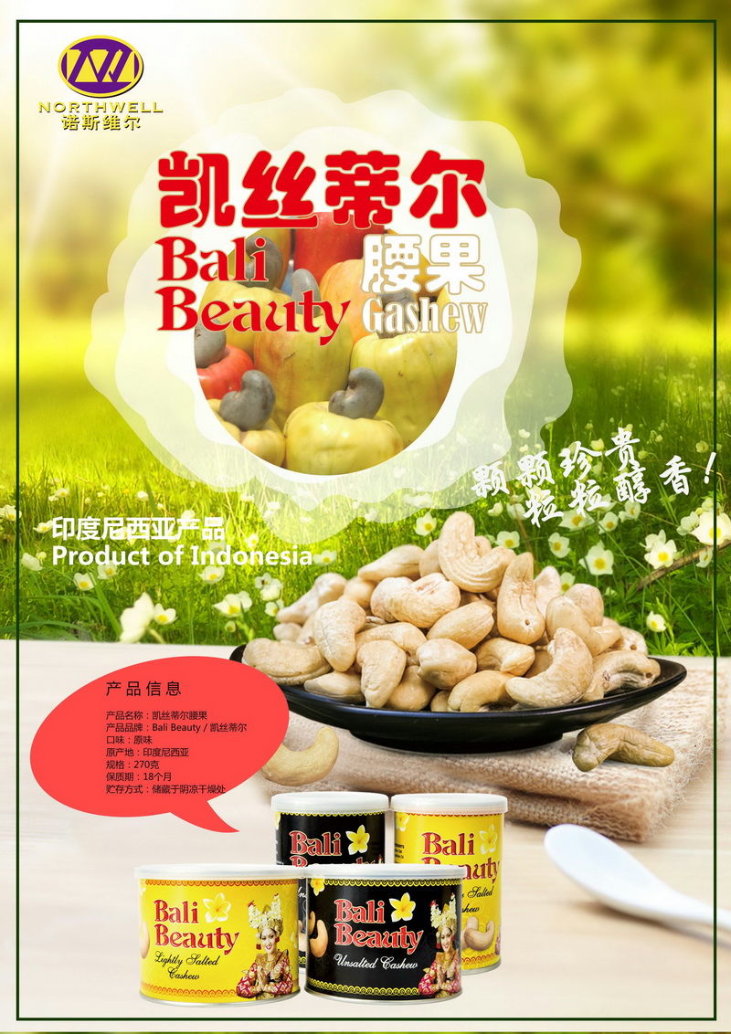 【凱絲蒂爾腰果】:產(chǎn)于印尼南部山區(qū)野生腰果樹,非人工培育種植,無農(nóng)藥無化學(xué)殘留,精挑細(xì)選W320的成熟果實(shí)手工去皮。凱絲蒂爾腰果顆顆珍貴,粒粒醇香。